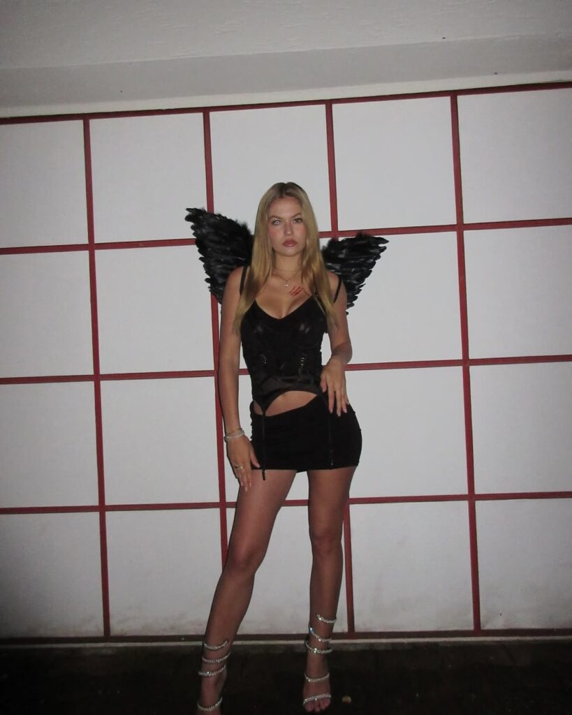 A dark angel costume with edgy accessories. Perfect for party shoots or trio costumes, emphasizing sharp, structured styling.
