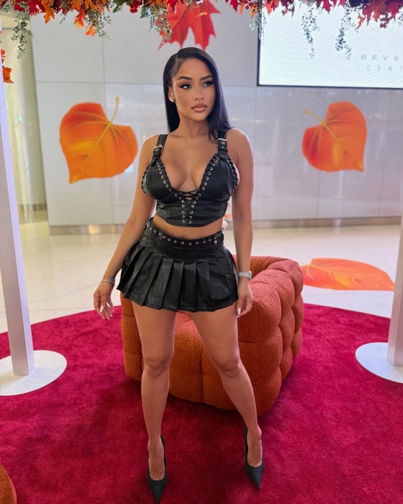 Sleek black leather outfit ideal for clubbing or late-night parties. Monochrome styling keeps the look modern and striking.