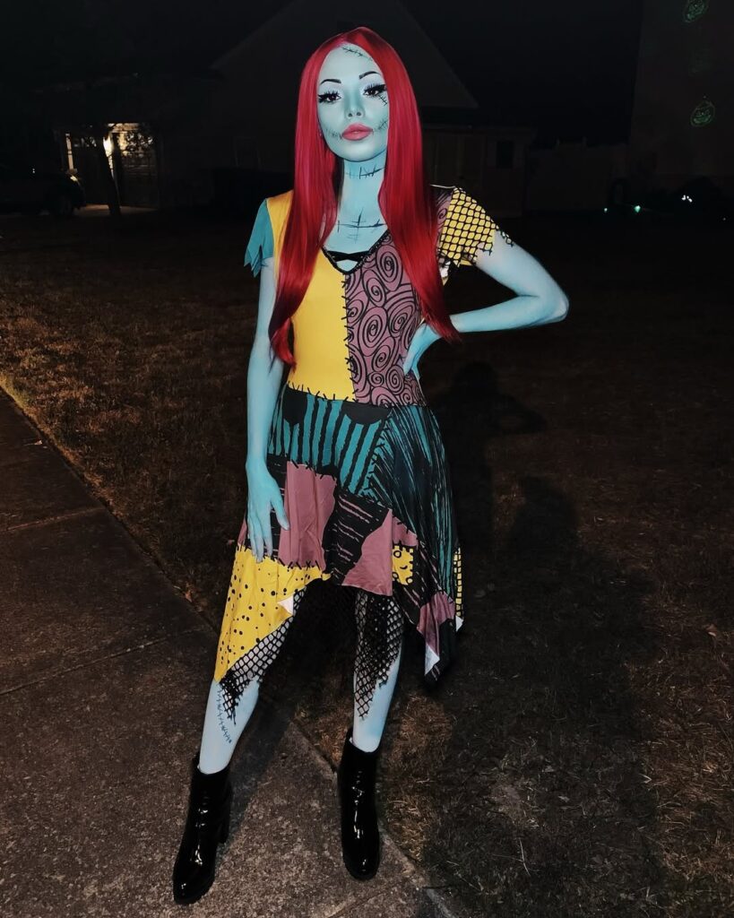 A whimsical patchwork doll costume with Halloween details. Perfect for kids’ events or casual gatherings, balancing cuteness and spooky charm.