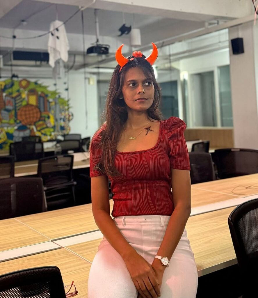 Quick, cute devil costume for workplace celebrations. Simple styling keeps it charming and low-effort.