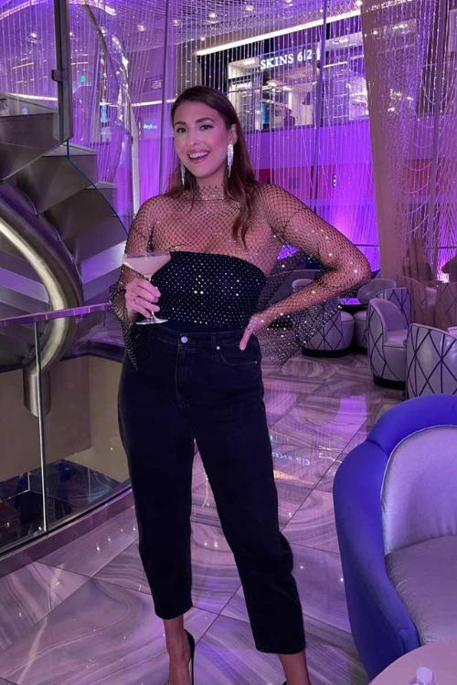 A rhinestone mesh top layered over a tube top with jeans creates a perfect balance between comfort and sparkle. The mesh adds glamour while the jeans keep the outfit relaxed. This stylish mix belongs to the Hottest Casino Outfits That Guarantee a playful and eye-catching look.