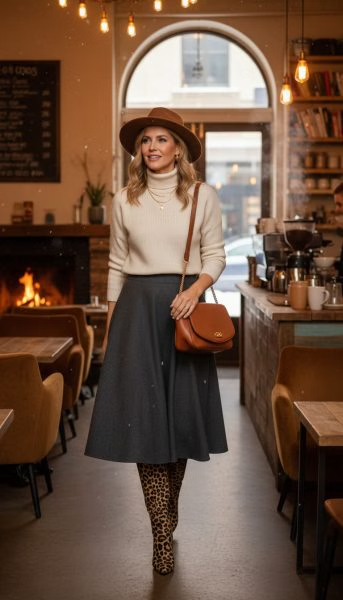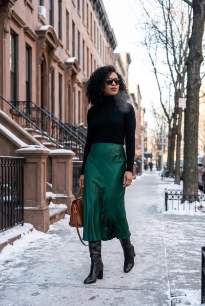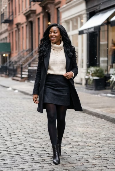 A fitted turtleneck keeps your upper body warm without adding bulk. It balances winter layers and makes skirts look intentional.