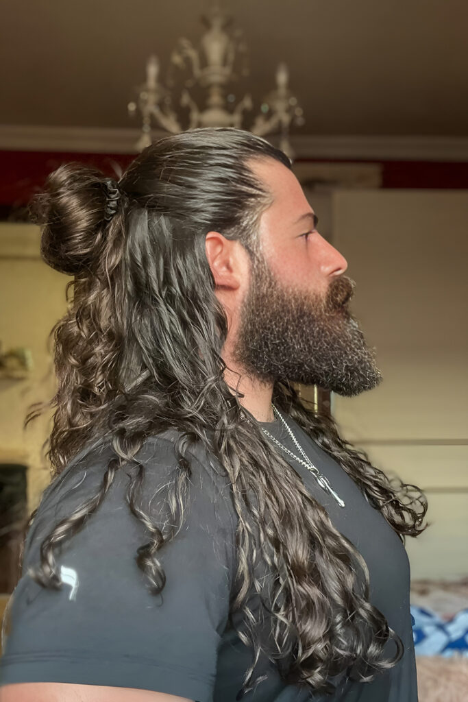 This is one of the most eye-catching styles I’ve tried. The layers define the curls, and the full beard adds depth.