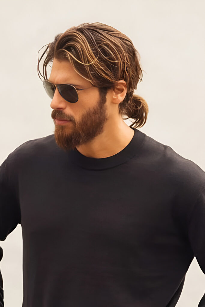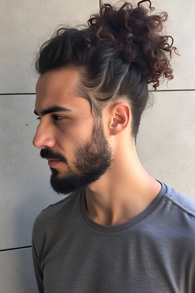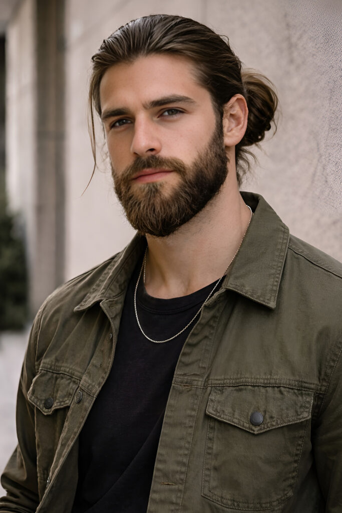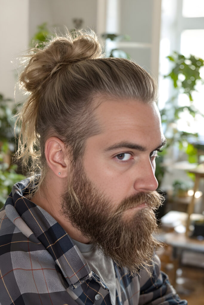 This is a stronger version of the classic man bun. The full beard adds more masculinity and structure.
