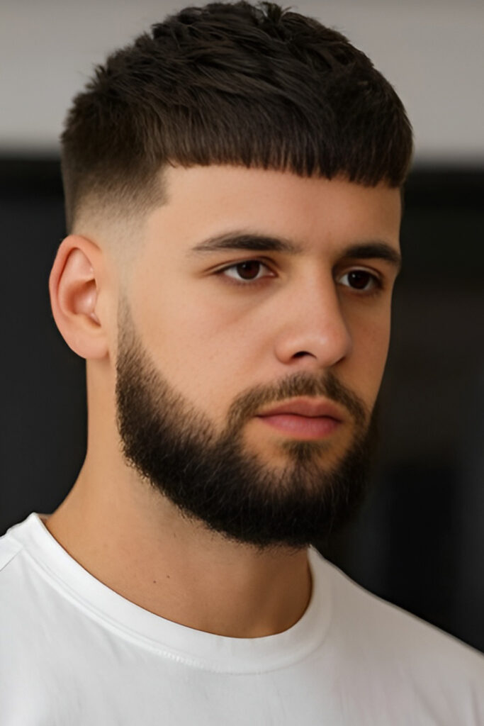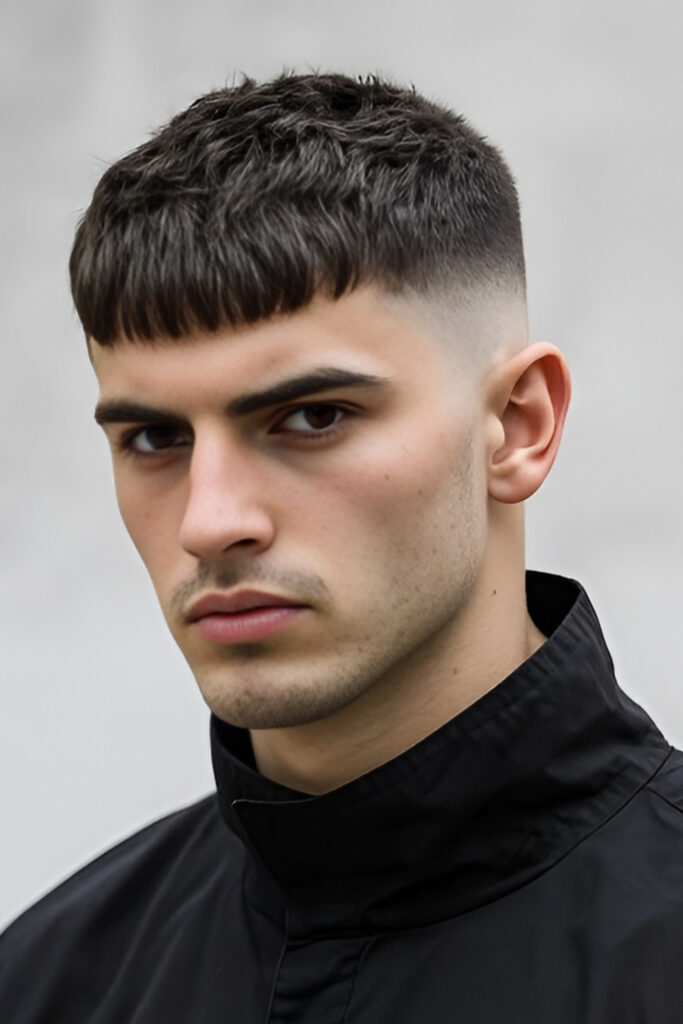 The Caesar cut is simple but effective. The straight fringe adds a defined look that’s easy to maintain.