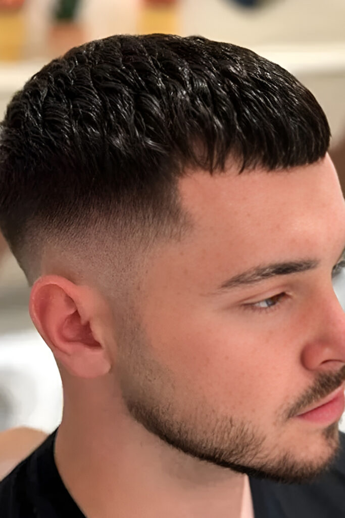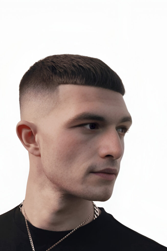 High Fade Caesar Haircut with Bold Contrast and Sharp Edges