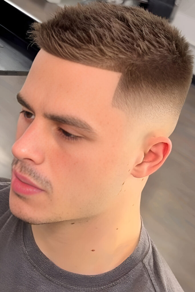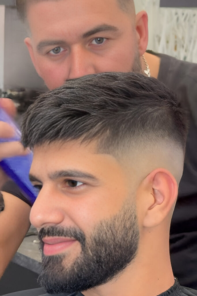 The skin fade creates a strong contrast that makes the haircut look very sharp. The sides go down to the skin, while the top stays short.