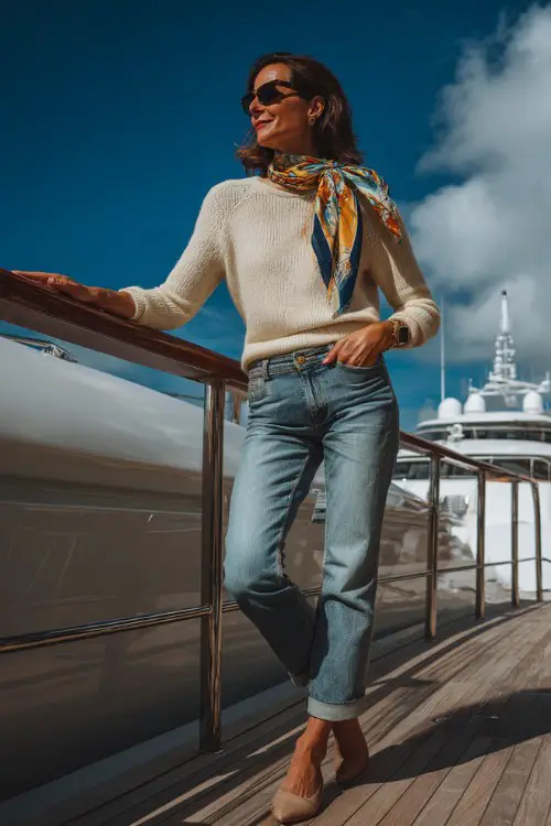 A lightweight sweater styled with straight jeans creates a relaxed yet elegant outfit. Adding a silk scarf introduces a refined detail that instantly elevates the entire look. This is a simple way to achieve Money Outfits with Jeans: Easy Looks without much effort.