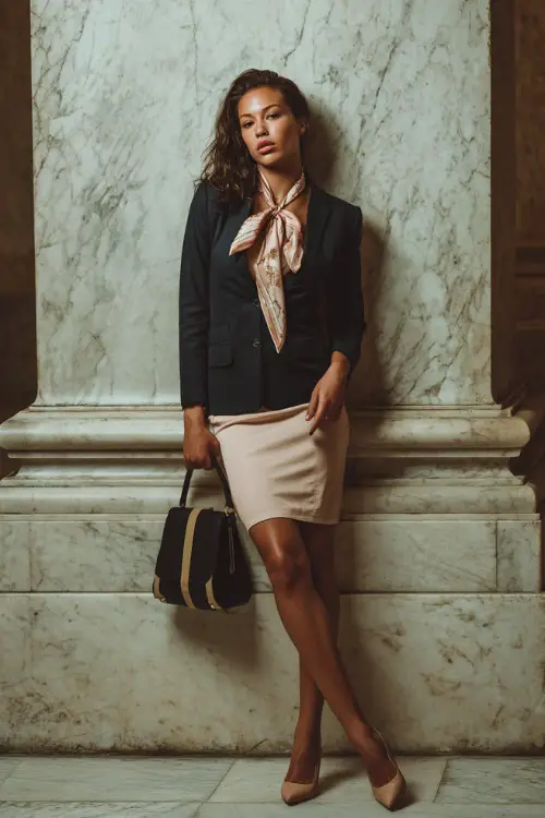 A softly tied silk scarf around the neckline brightens the look while keeping it refined. This is another beautiful example of how Money Outfits with Scarves can enhance classic workwear.
