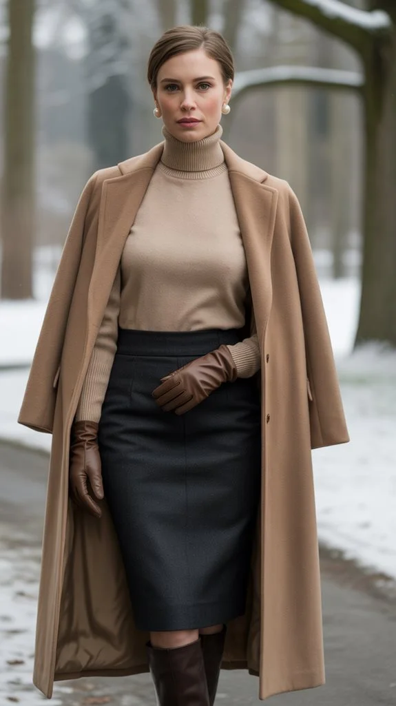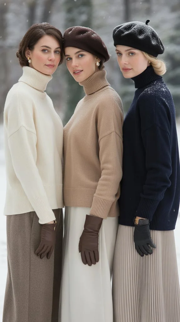 Whether you prefer a sleek single-breasted coat or a classic double-breasted design, a belted waist adds shape and refinement. Shades like charcoal, navy, or camel pair seamlessly with your existing wardrobe. Investing in a wool overcoat guarantees an elegant appearance while maintaining comfort in cold weather, perfectly complementing Old Money Winter Outfits.