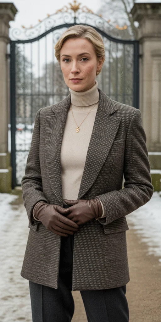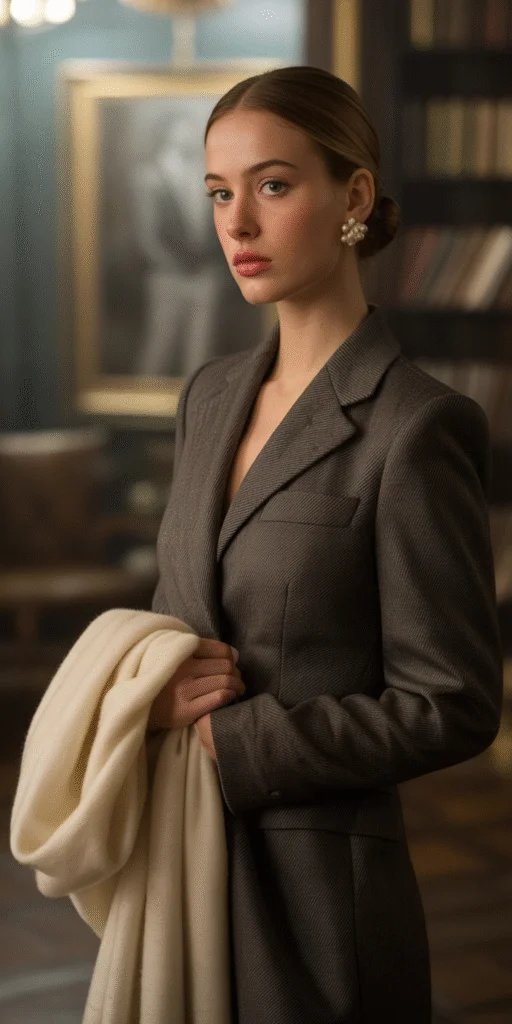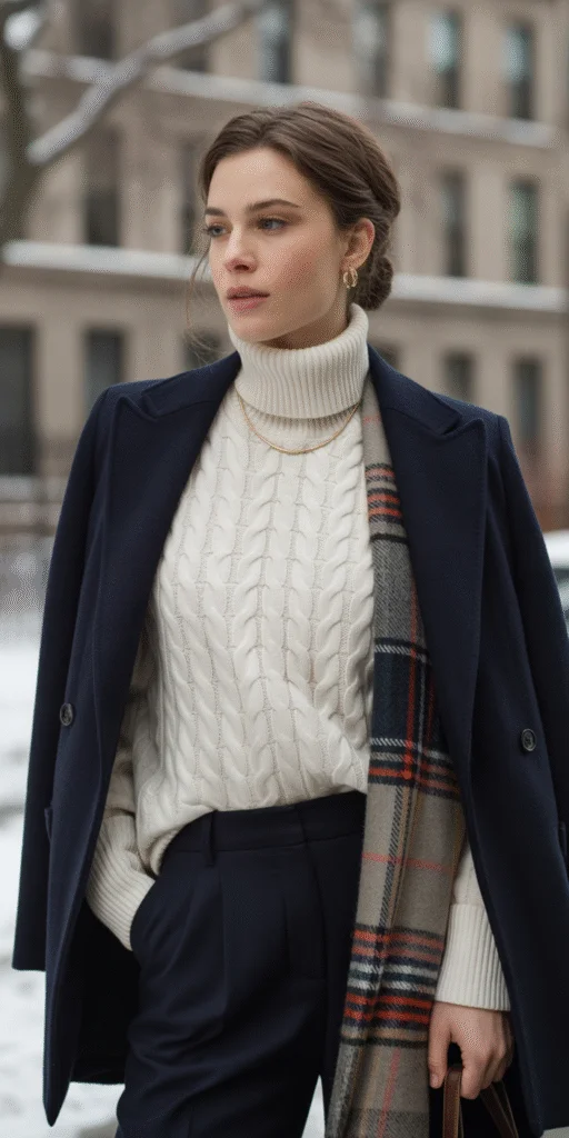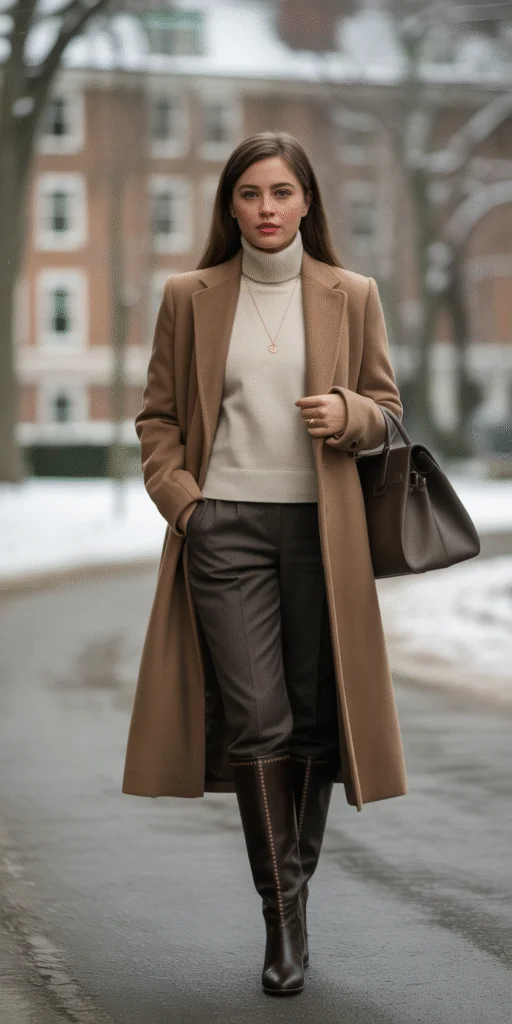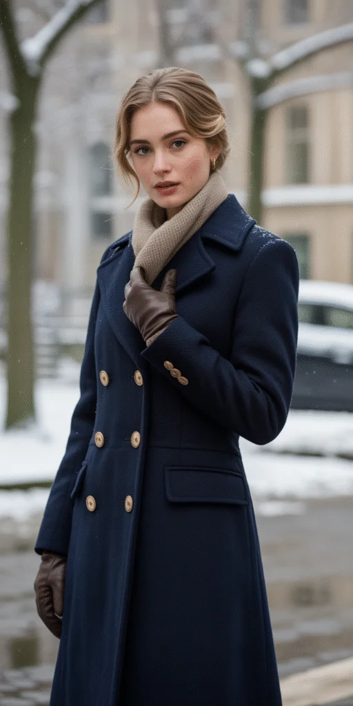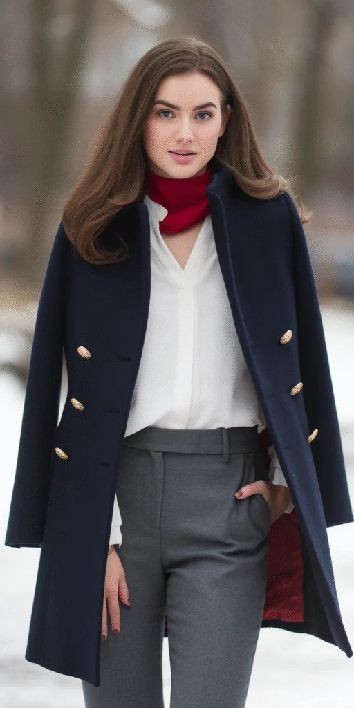 Style in navy or charcoal with tailored trousers and ankle boots. A silk scarf can enhance the ensemble, maintaining the sophistication that defines old-money-inspired winter wardrobes.