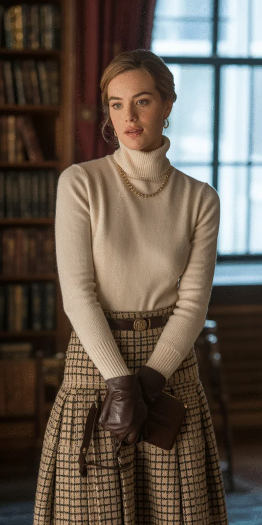 Combine with fitted turtlenecks or chunky knits for an effortlessly chic look. Knee-high boots or classic brogues complete a polished outfit that channels old-money sophistication.