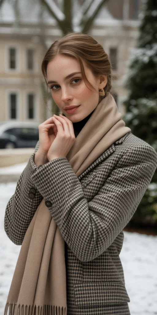 Mix with different textures for dynamic winter outfits, maintaining a balance of tradition and contemporary style. Houndstooth pieces are a timeless addition to Old Money Winter Outfits.