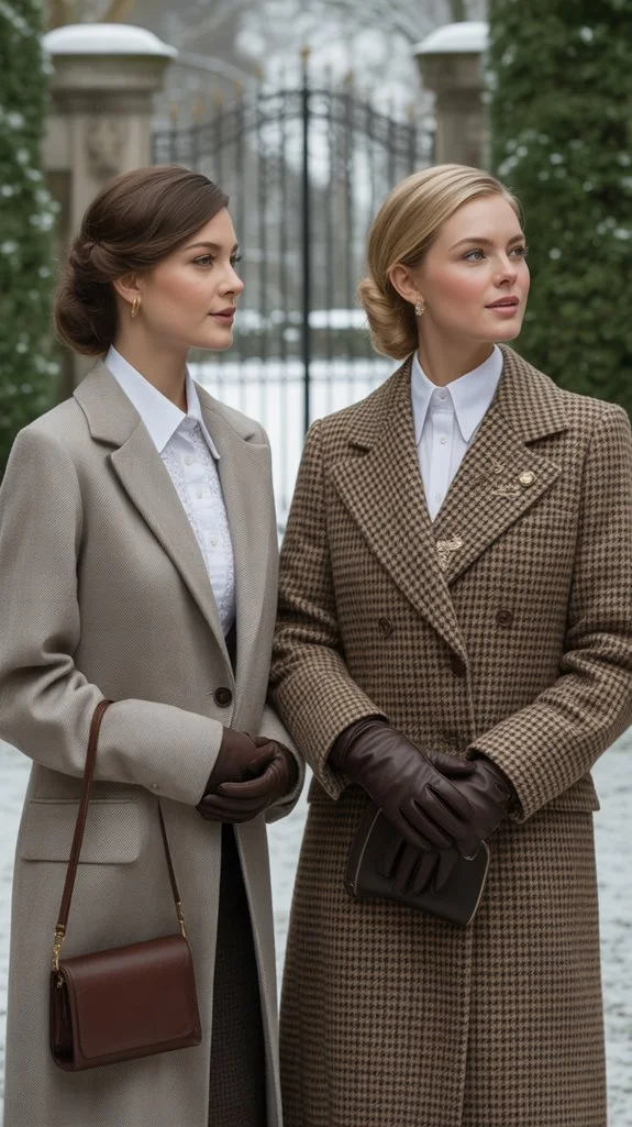 Select luxe fabrics like wool blends or cashmere for warmth, and neutral or plaid patterns for timeless appeal. Complement with understated jewelry and leather boots to balance traditional charm with modern polish.