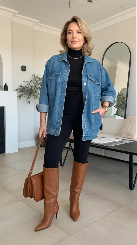 This outfit works because it keeps things simple and strong. A black top and black leggings create a long, clean line from head to toe. The oversized denim jacket adds ease and keeps the look from feeling stiff.
