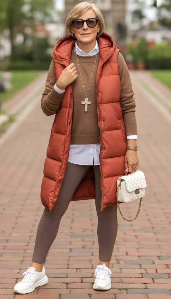 This look blends comfort with structure. A long puffer vest layered over a camel knit and white shirt feels relaxed but intentional. Taupe leggings keep it practical, while white sneakers make it easy to wear.