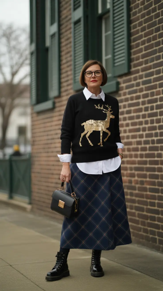 This outfit mixes classic and modern elements. A black sweater layered over a white shirt feels clean and sharp. The plaid midi skirt adds movement and interest.