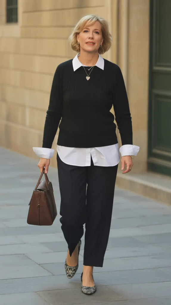 This is a timeless formula that always works. A white shirt under a black sweater creates contrast and structure. Cropped trousers keep the silhouette neat and modern.