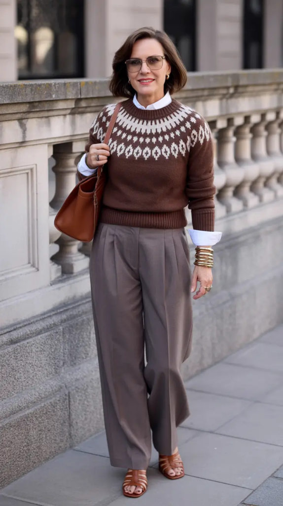 A Fair Isle sweater brings warmth and tradition without feeling old. Paired with wide-leg trousers, it feels balanced and modern.