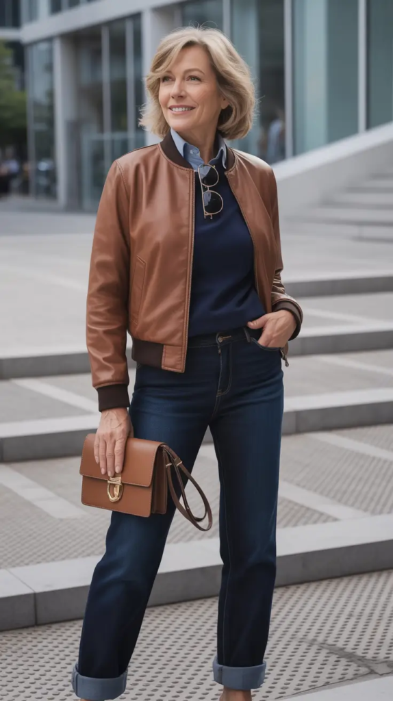 A leather bomber adds strength without heaviness. Paired with a navy sweater and dark denim, the outfit feels clean and modern.