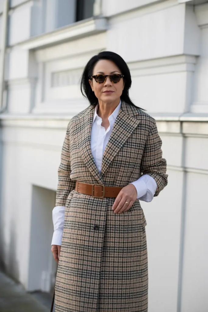 A belted coat brings shape and confidence. Worn over a crisp white shirt, it feels timeless and strong.