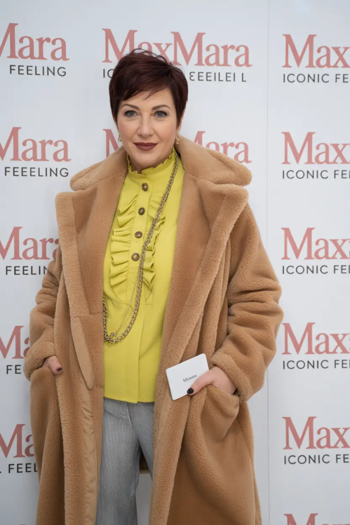 This look is bold but balanced. A camel coat keeps it grounded, while a chartreuse blouse adds energy.