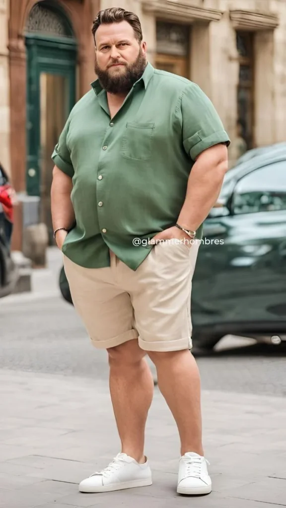 Smart-Casual Green Shirt and Khaki Shorts Look for Plus-Size Men