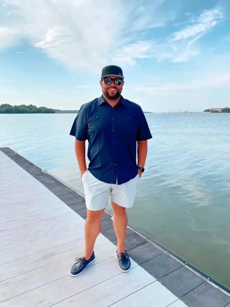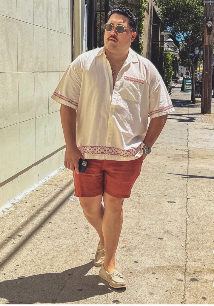 I like keeping things simple when dressing for warm days near water. A short-sleeve button-down with light shorts gives me that clean contrast without feeling heavy. From my experience, shorts that sit just above the knee help create a more balanced shape instead of looking oversized.
