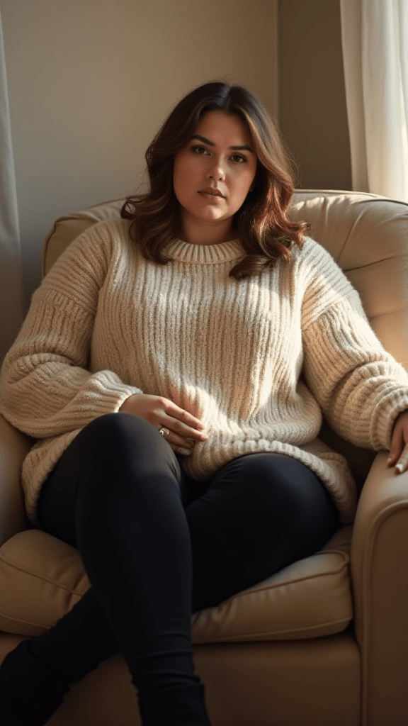 Few things feel as comforting as an oversized sweater, especially in chilly weather. A chunky knit in a soft beige tone pairs perfectly with black leggings and ankle boots for an outfit that blends comfort with style. Add a statement necklace to bring a little glam without sacrificing the relaxed feel. This look is a go-to for days when you want to stay cozy but still appear put together—a winning choice for Plus-Size Winter Outfits.