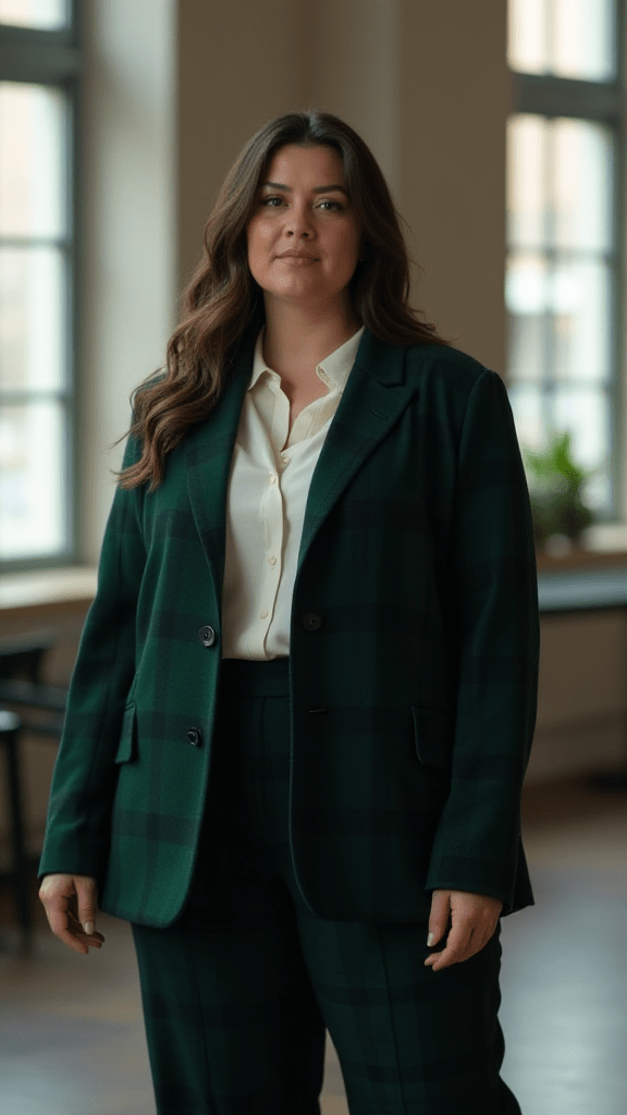 Want to command attention this winter? A plaid power suit in a rich, dark green shade offers a sharp, confident vibe. Pair the blazer and wide-leg pants with a crisp white blouse for a look that’s perfect for work or formal occasions. Experiment with plaid patterns and colors, but keep the tones deeper for a sophisticated finish. This ensemble brings a fresh take on professional Plus-Size Winter Outfits that are both stylish and strong.