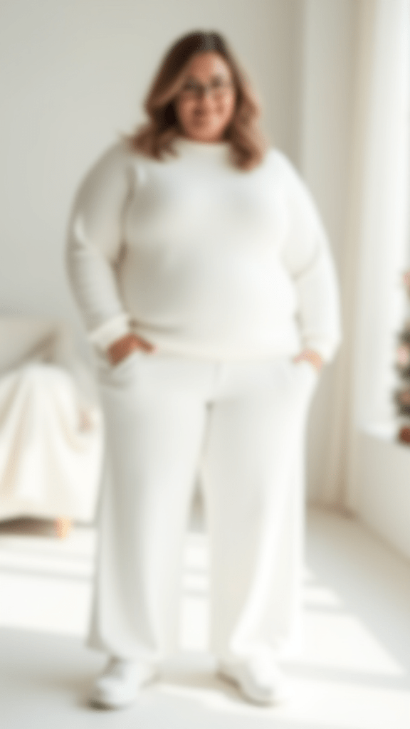 Wearing all white in winter feels fresh and unexpected. Combine a white sweater, wide-leg trousers, and white sneakers for a crisp, monochromatic look. This style stands out and feels clean, offering a fashionable twist on typical cold-weather outfits. While it requires a bit of care around spills, the payoff is a striking and modern ensemble. Monochrome dressing is a bold option for Plus-Size Winter Outfits that want to break the mold.