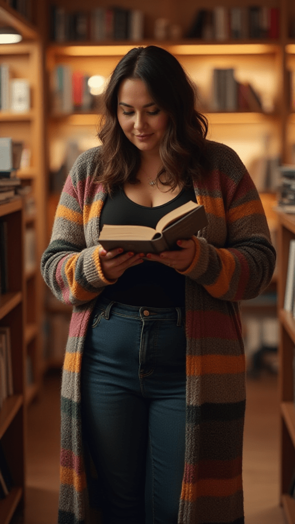 Winter doesn’t have to mean dull colors. Brighten your look with a long, multicolored striped cardigan layered over a black top and jeans. It’s cozy, visually interesting, and a great way to inject personality into your Plus-Size Winter Outfits. The cardigan’s length also helps smooth your silhouette while keeping you warm. This cheerful combination is a simple way to feel vibrant on gray winter days.