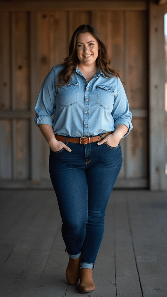 Embrace the classic Canadian tuxedo by pairing a light-wash denim shirt with darker jeans. This contrast creates a casual yet polished vibe, especially when accessorized with a brown belt and ankle boots. To avoid looking dated, choose denim pieces that fit well and are in good condition. Denim on denim is a timeless choice for casual Plus-Size Winter Outfits that balance comfort and style effortlessly.