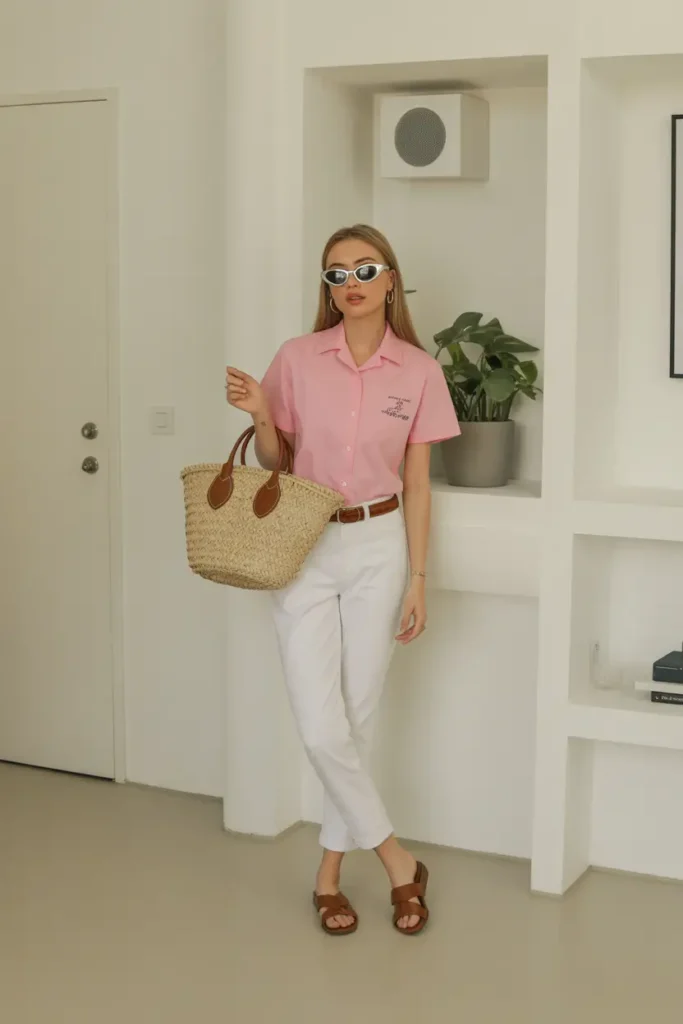Pastel tones bring lightness and seasonal freshness to spring wardrobes. Soft-colored tops paired with crisp neutrals feel optimistic but restrained. Accessories keep the outfit relaxed and wearable.