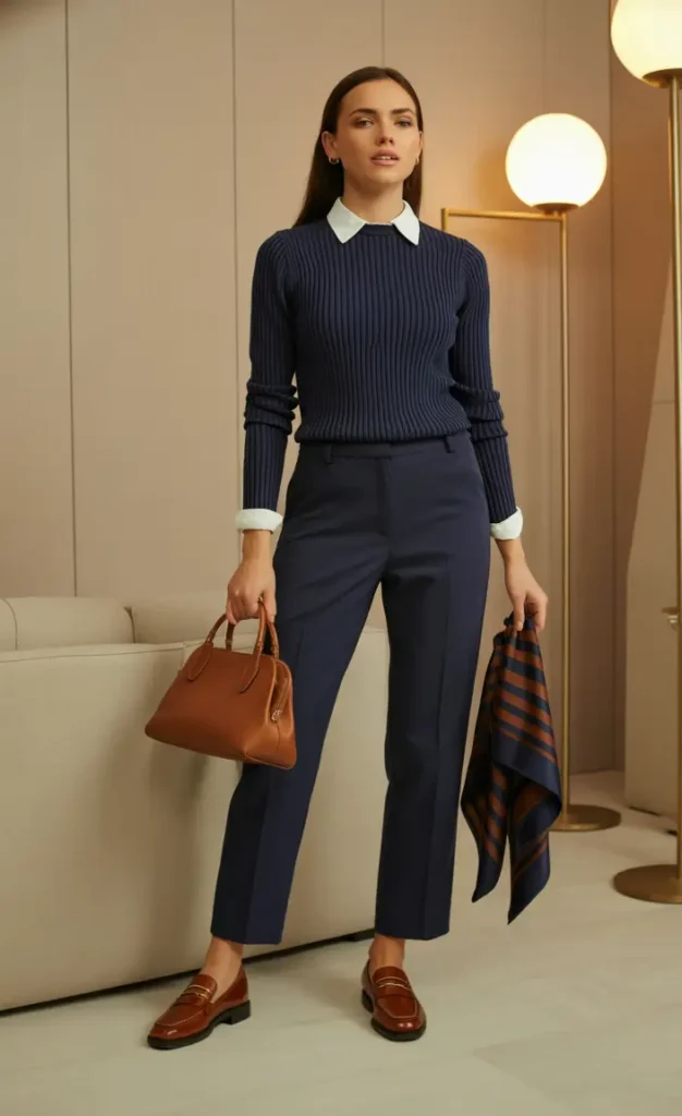 Well-cut knitwear offers structure while remaining comfortable. Layered over crisp details, knits add warmth and refinement without stiffness. Tailored trousers complete the look with balance.