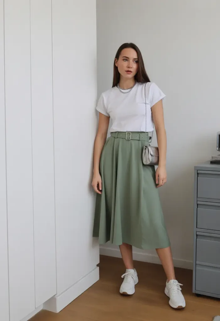 Minimal combinations built from familiar pieces can feel surprisingly fresh when proportions are right. A tucked-in tee with a denim midi skirt creates a clean, modern silhouette that fits easily into everyday life. Practical footwear keeps the look approachable while structured accessories add balance.