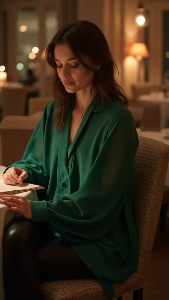 Sleek leather pants with a romantic silky blouse strike the right balance for a winter night out. It’s sophisticated with an edge—ideal for a Romantic Winter Date where you want to look polished but a little daring. Just steer clear of messy foods; silk and tomato sauce don’t mix.