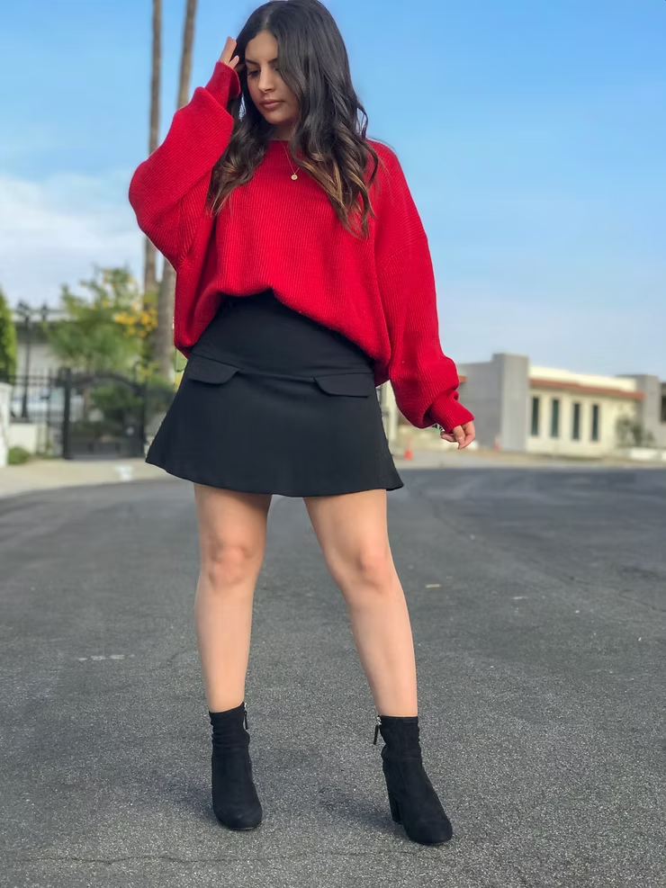 This look is for those who love to dress up a little more. Adding a skirt instantly makes the outfit feel flirty and stylish. The red sweater keeps the top cozy while the skirt adds a dressy touch.