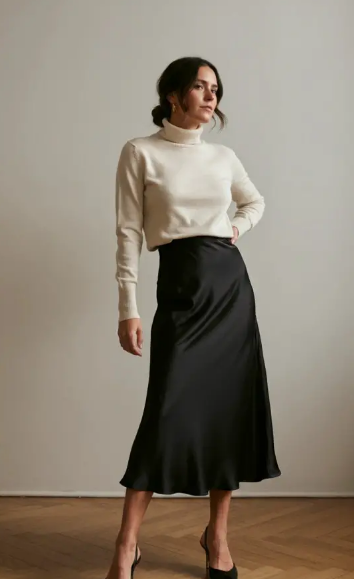 A black satin midi skirt gives you a timeless starting point. Match it with a soft cream cashmere turtleneck for an elegant contrast.
