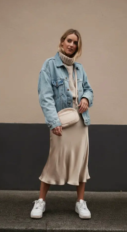 Tone down the shine of a champagne satin midi with a relaxed, oversized denim jacket. Pair it with clean white sneakers for a trendy streetwear-inspired vibe.