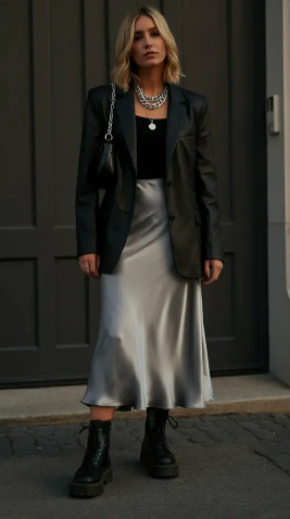 Opt for a silver satin skirt when you want your outfit to stand out. Add a black leather blazer for contrast and a bit of attitude. Finish with combat boots and bold silver accessories.