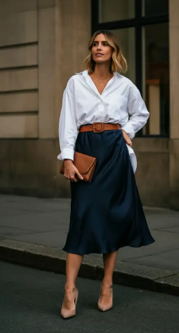 A navy satin skirt brings in a touch of refined style. Tuck in a clean white button-down shirt for a smart finish.