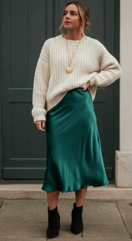 An emerald satin skirt introduces a bold, rich tone to your look. Soften it with a thick cream sweater for balance.