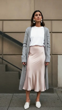 Begin with a light blush satin skirt as your base. Add a long gray cardigan layered over a plain white tee for a cozy, laid-back feel.