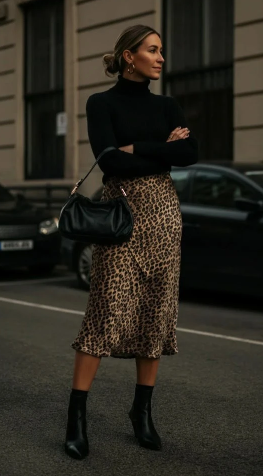 Turn heads with a leopard-print satin skirt as the focal point. Let the print stand out by pairing it with an all-black turtleneck and boots.