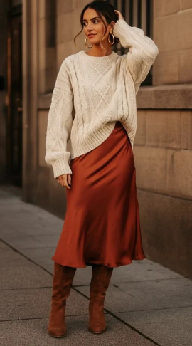 A rust satin skirt brings warm tones perfect for fall. Layer with a cream cable-knit sweater for a seasonal contrast. Knee-high brown boots give the outfit an elegant touch.