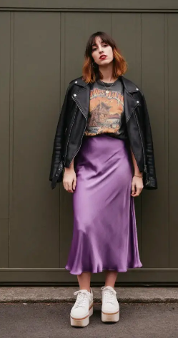 Go for a purple satin skirt to add unexpected flair. A vintage-inspired graphic tee makes the outfit feel laid-back and creative.