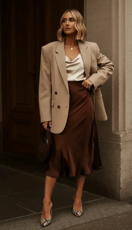 A chocolate satin skirt feels rich and refined. Layer it with a beige oversized blazer for a stylish contrast. Underneath, wear a soft white camisole.