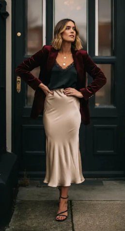 Build your look around a champagne-colored satin midi skirt. Add depth with a burgundy velvet blazer on top. A black camisole underneath keeps it simple.