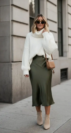 Olive green satin brings a structured yet soft military tone. Match it with a thick white turtleneck sweater for a crisp pairing. Beige ankle boots maintain a neutral palette.